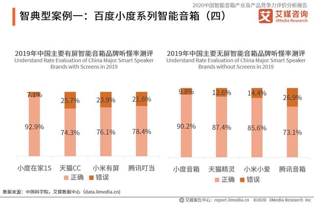 根据中国科学院测评数据显示,在对智能音箱的听懂率测评上,百度旗下的智能音箱是四个主要品牌里唯一听懂率达到90%以上的。在有屏智能音箱听懂率上,天猫CC是四个品牌里面听懂率最低的,在无屏智能音箱听懂率中,腾讯音箱是是四个品牌里面听懂率最低的。艾媒咨询分析师认为,百度重视研发是小度智能音箱拥有领先听清率和听懂率的重要原因之一。