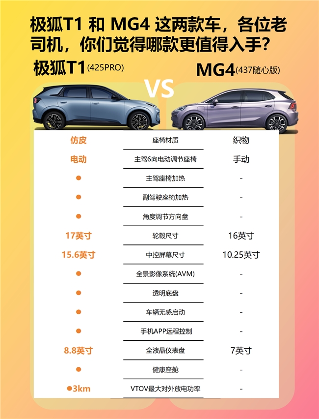 在10万以内纯电市场挑选车型,不少人会纠结配置、健康、售后等细节,毕竟这些直接影响日常用车体验。这次咱们就拿极狐T1和MG4来对比,从大家关心的健康座舱、快充、屏幕配置、座椅功能到售后,看看谁更能满足日常需求。